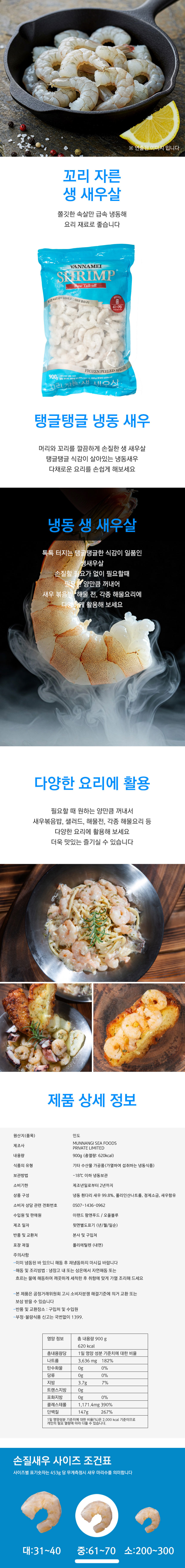 꼬리를 제거해 손질된 인도산 생새우살. 탱글한 식감과 담백한 맛으로 각종 요리에 활용도 높습니다.