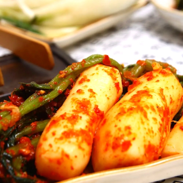 아삭한 식감과 시원한 맛이 조화로운 국내산 총각김치. 한입 베어물면 느껴지는 깊은 감칠맛과 깔끔한 매운맛!
